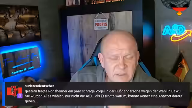 00:02:19Der LiveStream des Kanals 'carstenjahn_teamheimat' startete um 18:58 Uhr und wurde auf mehreren Plattformen wie D-Live, Gettr, Facebook, Twitch und X übertragen. Der Streamer begrüßte sein Publikum und sendete herzliche Grüße in verschiedene Regionen Deutschlands, darunter Stuttgart, Engelskirchen, Leipzig, Thüringen und Gelsenkirchen. Nach der offiziellen Begrüßung wechselte der Streamer zu politischen Kommentaren und kündigte an, über ein anstehendes Kartellgesetz in Sachsen-Anhalt zu berichten, das seiner Meinung nach der Machtabsicherung der Altparteien dient.