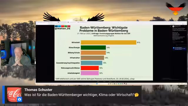 Im Rahmen einer Live-Übertragung wurden innen- und außenpolitische Themen diskutiert. Es wurde die Energiepolitik scharf kritisiert und die politische Lage in Deutschland beleuchtet. Dabei wurden unter anderem der Ukraine-Konflikt sowie die Eskalation mit dem Iran analysiert. Zum Abschluss wurden der Wahlkampf in Baden-Württemberg und weitere politische Meldungen besprochen.