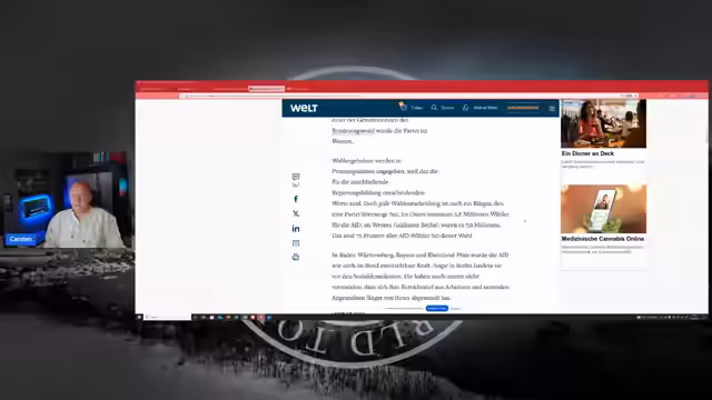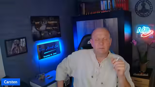 00:22:39Auf die Frage eines Chatters, ob er Mitglied der AfD sei, stellt der Streamer klar, dass er zwar auf der AfD-Liste angetreten und in den Stadtrat eingezogen ist, aber kein Parteimitglied. Er betont seine Unabhängigkeit. Zudem wird auf sein Verhältnis zu 'DC' eingegangen. Jener war während des Streams zwar technisch anwesend, konnte aber nicht zu sehen sein. Carsten Jahn betont, dass es keine persönliche Differenz gebe und man sich gegenseitig schätze, auch wenn Kritik an Fehlern geübt werden könne. Er versichert, dass DC auf YouTube gesperrt sei.
