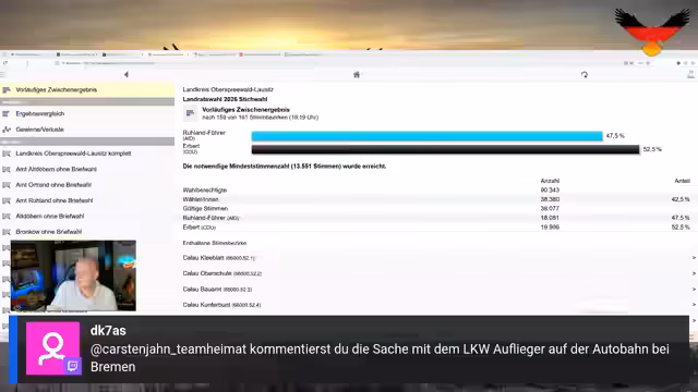 00:01:30Im Fokus des Streams steht die Landratswahl in Oberspreewald-Lausitz, bei der nach Auszählung von 159 von 161 Wahlbezirken der CDU-Kandidat Erbert mit 50,2 Prozent knapp vor der AfD-Kandidatin Roland-Führer (49,8 Prozent) liegt. Der Streamer kritisiert die extrem niedrige Wahlbeteiligung von nur 38,8 Prozent als zentrales Problem. Er wertet das Ergebnis als einen Sieg des sogenannten „SED-Kartells“ aus CDU, SPD, Linken, Grünen und FDP, das sich hinter einem Kandidaten verbündet hat, und als Trauerspiel für die Demokratie, da die AfD trotz ihres starken Ergebnisses die Wahl verliert.