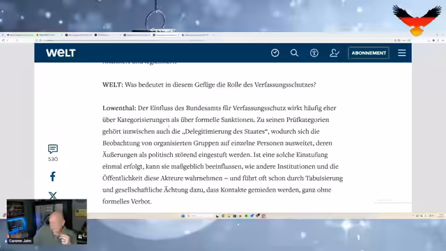 01:24:29Ein Interview mit dem australischen Forscher Andrew Lowenthal deckt einen umfassenden 'Zensur-Industrie-Komplex' in Deutschland auf. Er beschreibt ein Netzwerk aus NGOs, Behörden und Tech-Firmen, das unter dem Vorwand der Desinformationsbekämpfung Inhalte kontrolliert. Als Paradebeispiel wird das Bundesprogramm 'Demokratie leben' genannt (200 Mio. Euro/Jahr), das Organisationen wie HateAid als 'Trusted Flagger' nutzt. Lowenthal stellt fest: Deutschland übertrifft die USA an staatlicher Kontrolle, da die Zusammenarbeit zwischen Staat und Zivilgesellschaft enger und weniger transparent sei. Dies gefährde die Meinungsfreiheit und fördere Spaltung.