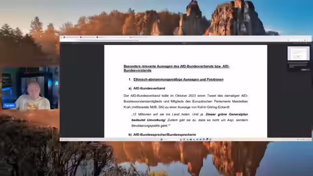 00:38:20Ein zentraler Punkt des Streams war die Darstellung und Analyse des vom Verfassungsschutz Brandenburg veröffentlichten Dokuments, das die AfD als "gesichert rechtsextrem" einstuft. Der Streamer präsentiert 17 Seiten dieses Gutachtens und analysiert die darin genannten Aussagen der Partei. Er widerlegt die Einstufung und argumentiert, dass es sich bei den zitierten Positionen (z.B. Begriffe wie "Umvolkung" oder "Bevölkerungsaustausch") um legitime politische Meinungsäußerungen handelt, die durch das Grundgesetz geschützt sind. Er kritisiert, dass die Einschätzung ungeprüft veröffentlicht wurde, um eine politische Opposition auszuschalten.