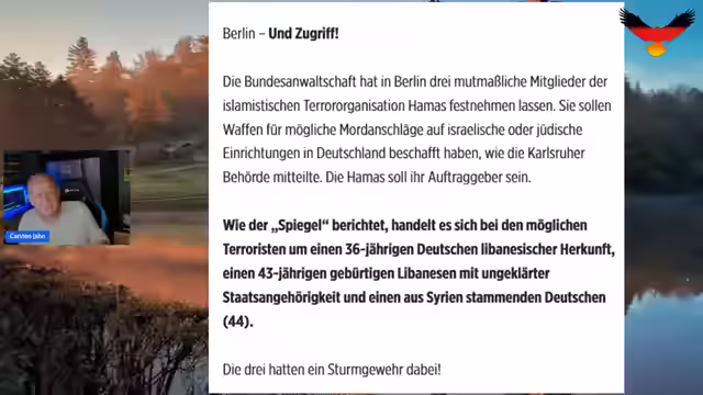 Der Kanal carstenjahn_teamheimat analysiert aktuelle Ereignisse: Von einem Mordfall in den USA und dessen Parallelen zur deutschen Justiz, über ein neues EU-Gesetz, das die Meinungsfreiheit einschränkt, bis hin zu Angriffen auf CDU-Büros. Es wird die Festnahme mutmaßlicher Hamas-Mitglieder in Berlin thematisiert, Bürokratieabbau kritisiert und eine Entschuldigung für Falschinformationen gefordert. Der Streamer äußert sich kritisch über Medienberichte und die Zusammenarbeit von CDU und AfD.