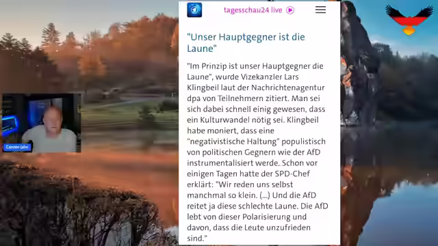 01:02:07Der Streamer äußert sich skeptisch über den Bürokratieabbau und kritisiert die Fokussierung auf Digitalisierung ohne tatsächliche Vereinfachung. Er verspottet die Behauptung der SPD, ihr Hauptgegner sei die gute Laune, und zitiert Vizekanzler Lars Klingbeil. Er kritisiert die SPD und CDU dafür, dass sie sich auf interne Befindlichkeiten konzentrieren, anstatt Politik für Deutschland zu machen. Er wirft ihnen vor, das Land auszunehmen und keinen Krieg führen zu wollen. Er kritisiert die Grünen und die Ampel-Koalition für ihre Politik und die daraus resultierenden Probleme. Er betont, dass die deutsche Kultur erhalten bleiben muss und nicht durch die "durchgeknallte Kultur" der Politiker zerstört werden darf.