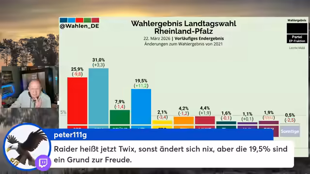00:10:07Der Stream wurde um 18 Uhr auf Twitch gestartet. In den ersten Minuten ging der Streamer auf die Wahlergebnisse von Rheinland-Pfalz ein und kommentierte das starke Ergebnis der AfD, die von 11,2 auf über 19,5 Prozent zulegte. Er betonte, dass die AfD nun den Status des Oppositionsführers im Landtag innehat und die Möglichkeit hat, Untersuchungsausschüsse einzurichten. Gleichzeitig kritisierte er die Koalitionsbildung zwischen CDU und SPD, die er als unechten Wechsel bezeichnete, da die alte Regierungspartei SPD weiterhin beteiligt sei.