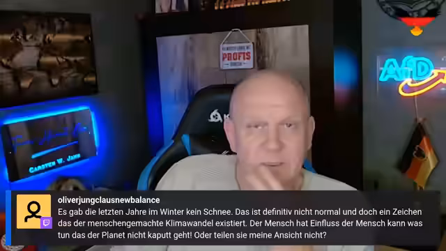 01:26:25Es wird eine klare Befürwortung der freien Marktwirtschaft ausgedrückt. Der Streamer lehnt staatliche Subventionen, wie sie für Elektroautos gewährt werden, ab und argumentiert, dass sich der beste Markt anbieten solle. Er selbst bevorzugt Dieselautos und spricht von seiner Vorliebe für V6-, V8- und V8-Motoren. Kritik übt er an staatlicher Umweltpolitik, wie dem Verbot von Verbrennungsmotoren, und lehnt es ab, Kinder oder Tiere auf politischen Veranstaltungen mitzunehmen. Bei einer Diskussion über Klimawandel und Schnee wird der Klimamann Kai Zorn als seriöse Quelle empfohlen.