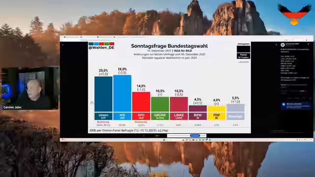 01:08:19Die Diskussion beginnt mit den Landtagswahlen in Rheinland-Pfalz, wo die politische Stimmung mit dem Staubwischen verglichen wird. Es folgt ein Überblick über aktuelle Umfragewerte: Bei Insa verliert die AfD 0,5%, bleibt aber führend, während CDU und BSW jeweils 0,5% gewinnen. Die SPD und die Linke verlieren je 1%. Bei YouGov führt die AfD erneut, nachdem sie im November kurz hinter der CDU lag. Landtagsumfragen werden für Thüringen und Bayern diskutiert, mit Hinweisen auf mögliche neue Erhebungen für Mecklenburg-Vorpommern und Sachsen-Anhalt.