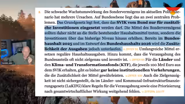 01:45:13Der Streamer präsentiert ein Gutachten der deutschen Wirtschaftsweisen, das die Finanzpolitik der Bundesregierung stark kritisiert. Es wird aufgezeigt, dass das Sondervermögen, das ursprünglich für zusätzliche Investitionen und Klimaschutz vorgesehen war, stattdessen zur Stopfung von Finanzierungslücken in alten Haushaltsplanungen und für „rein konsumtive Ausgaben mit teils recht fragwürdiger Priorität“ verwendet wird. Dies wird als Bruch von Versprechen und als Täuschung der Öffentlichkeit durch Friedrich Merz und die Bundesregierung dargestellt. Die Wirtschaftsweisen schätzen, dass bis 2030 weniger als die Hälfte der Mittel des Sondervermögens in zusätzliche Ausgaben fließen werden, was die möglichen Auswirkungen auf das gesamtwirtschaftliche Wachstum massiv mindert. Die fehlende Transparenz und das ineffektive Monitoring bei der Verausgabung der Mittel werden ebenfalls bemängelt. Besonders gravierend ist der Vorwurf, dass die Bundesregierung durch diese Handhabung des Sondervermögens gegen das Grundgesetz verstößt, da dieses festlegt, dass die Mittel nur für zusätzliche Investitionen eingesetzt werden dürfen. Der Streamer fordert, dass die Bürger dies erkennen und hinterfragt die Legitimität der aktuellen Regierung angesichts dieser Enthüllungen.