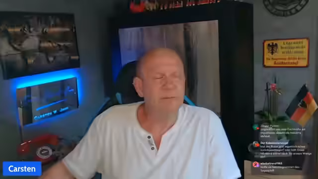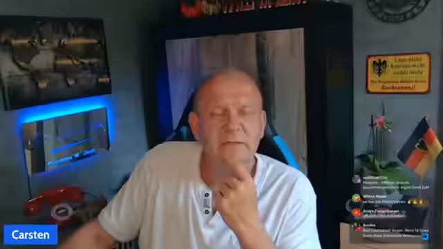 00:01:41Der Stream mit dem Titel 'Sonntagabend LIVE 19:00 Uhr' vom Kanal 'carstenjahn_teamheimat' beginnt gegen 19 Uhr. Der Streamer begrüßt seine Zuschauer auf verschiedenen Plattformen wie YouTube, DLive, GetterX und Twitch. Er erwähnt Restreaming-Partner wie Herrn Germann, Stormseeker und Andreas Prinz. Der Streamer gibt ein kurzes Überblick über die Orte, aus denen die Zuschauer grüßen, darunter verschiedene Städte in Deutschland und internationale Standorte wie Spanien und Ägypten. Dabei fällt er durch seine umgangssprachliche und humorvolle Art auf, die durch die gesamte Unterhaltung deutlich wird.