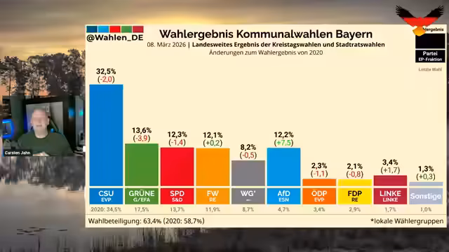 00:40:30Das Ergebnis der Kommunalwahlen in Bayern wird analysiert. Die AfD konnte ihr Ergebnis auf 12,2 Prozent mehr als verdoppeln und ist in fast allen Gemeinden in Fraktionsstärke eingezogen. Dies wird als großer Strukturerfolg gewertet. Gleichzeitig wird das schlechteste Ergebnis der CSU unter Markus Söder hervorgehoben. Die AfD sieht sich trotz des schwierigen Umfelds auf kommunaler Ebene stark positioniert.