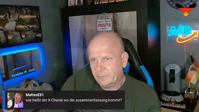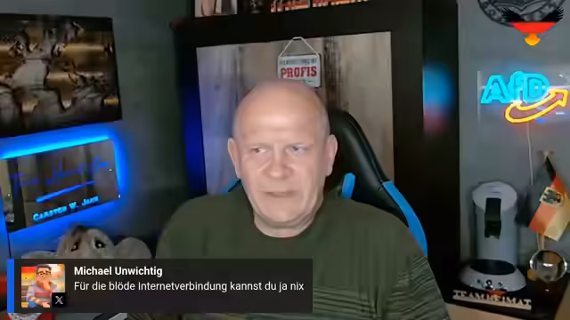 00:10:07Der Stream um 18 Uhr wird gestartet. Der Streamer begrüßt seine Zuschauer aus verschiedenen Regionen Deutschlands. Er entschuldigt sich für den geplatzten Stream vom Vortag, bei dem die Übertragungtechnik im Bunker versagte. Trotz der technischen Probleme konnte ein kurzes Interview mit Uli eingebaut werden. Zukünftige Großveranstaltungen, insbesondere Wahlkampfveranstaltungen in Sachsen-Anhalt, angekündigt.