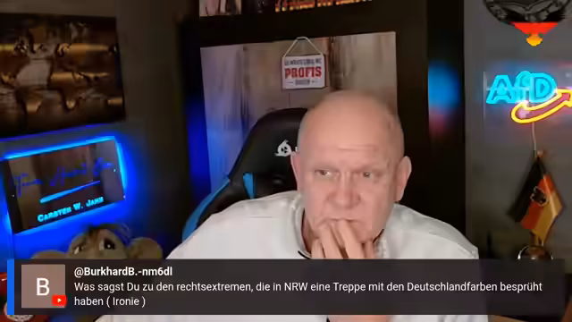 00:22:47Ein zentrales Thema ist die Debatte um AfD-Politiker Björn Höcke, der im Thüringer Landtag einen SA-Spruch zitierte. Der Streamer kritisiert die überzogene öffentliche Reaktion und erinnert daran, dass nach der Thüringer Verfassung eine Verurteilung aufgrund der Identität schwer sei. Er wundert sich über die媒体hetze und fragt rhetorisch, warum es immer nur gegen Höcke gehe, während andere Politiker ohne Konsequenzen agierten. Er deutet die Kampagne als panische Reaktion der Altparteien auf die hohe Popularität der AfD und warnt vor einer gezielten Schmutzkampagne bis zur nächsten Wahl.