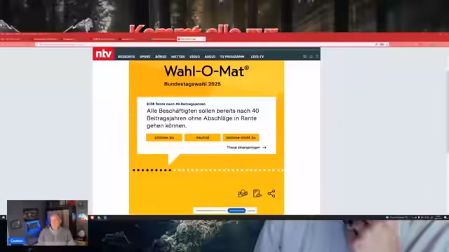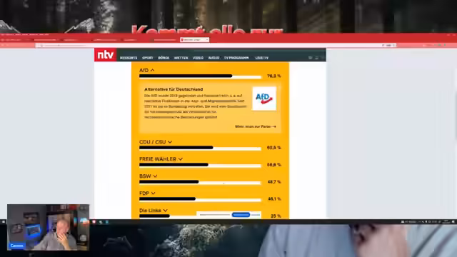01:21:19Der Streamer nutzt den Wahl-O-Mat, um seine politische Einstellung mit verschiedenen Parteien abzugleichen, und kritisiert dessen Methodik und einige fragwürdige Fragen. Er kommt zu dem Ergebnis, dass seine politischen Ansichten am ehesten mit der AfD übereinstimmen. Er bewertet auch andere Parteien wie die Grünen, die SPD und Die Linke und äußert sich kritisch über deren laut seiner Meinung falsche oder irreführenden Selbstbeschreibungen im Wahl-O-Mat.