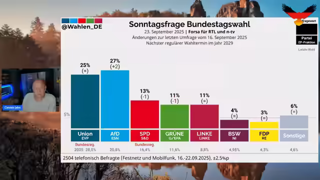 Die Sendung beleuchtet Identitätsmissbrauch auf Twitch und die fehlende Reaktion der Plattform. Weiterhin werden Donald Trumps UN-Besuch mit Rolltreppen- und Teleprompter-Problemen sowie seine Rede zu Migration und Klimawandel analysiert. Es folgen Reaktionen auf Trumps Aussagen und Spekulationen über seine Motive. Zudem geht es um Verschwörungstheorien, die Beschlagnahmung des Adenauer Busses, Kritik an Markus Söder und die AfD sowie deren Wahlerfolge und die Rolle des Migrationshintergrunds.