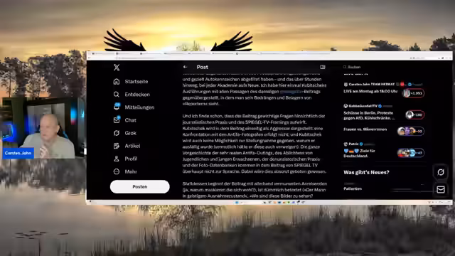 00:19:47Ein vom Streamer als "spitzenklasse" und "eines der besten der letzten Wochen" bezeichnetes Interview von Jasmin Kosobek mit dem als rechtsextrem eingestuften Vordenker Götz Kubitschek wird besprochen. Besonders ab der Hälfte des Interviews wurde der Inhalt als sehr stark empfunden, da Kubitschek gebildet wirkte und auf Vorurteile einging. Das Interview sei bei Kosobek zu finden und werde wärmstens empfohlen.