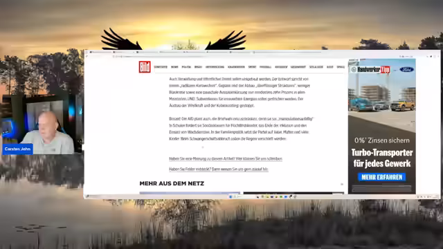 01:00:15Die panische Reaktion der Medien, exemplarisch an der "Volksstimme" in Sachsen-Anhalt, wird analysiert. Diese titelt mit "Entsetzen über AfD-Programm", während der Streamer argumentiert, dass es sich um in Umfragen gewünschte Programmpunkte handelt, die normalen Bürgern gefallen. Die Medien greifen dabei einzelne Schlagwörter heraus und verteufeln sie, um von anderen wichtigen politischen Themen abzulenken und Desinformation zu betreiben.