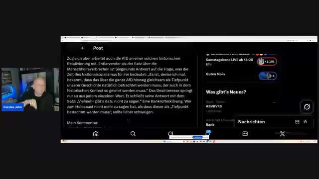 00:19:22Die Analyse konzentriert sich auf eine heftige Debatte um ein Interview von Politico-Journalist Gordon Rapinski mit AfD-Politiker Ulrich Siegmund. Dabei wird Rapinski vorgeworfen, das Interview durch gezieltes Framing und das bewusste Weglassen entlastender Aussagen missverständlich darzustellen, um Siegmund als Holocaust-Leugner darzustellen. Es werden Positionen von Journalisten wie Pauline Voss und gegensätzliche Kommentare von Nutzern wie Herrn Caron zitiert, die eine Uneinigkeit innerhalb der medialen Berichterstattung aufzeigen.