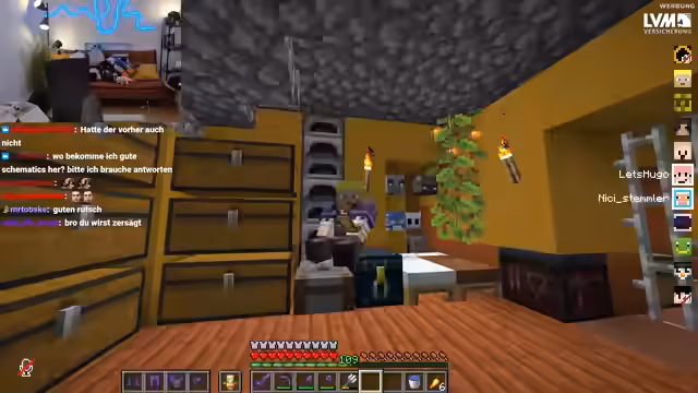 00:49:10Die Interaktion mit der Community führt zu humorvollen und chaotischen Situationen. Ein prominentes Beispiel ist Paul, der versucht, Creeper zu töten, um Gunpowder für TNT zu farmen, aber durch einen Missverständnis von Heiko und Feli versehentlich seine eigene Basis in die Luft jagt. Dieser Vorfall sorgte für viel Gelächter und zeigt den locker, oft etwas unorganisierten Umgang im Stream.