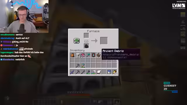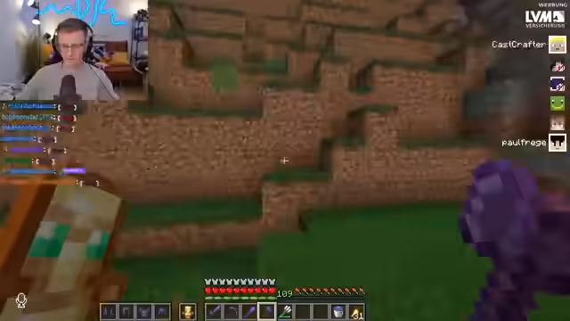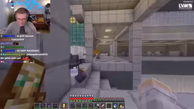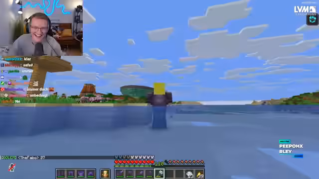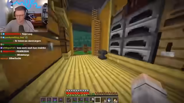 09:19:18Die Unterhaltung beginnt mit einer Diskussion über ein Soundboard, gefolgt von einem kurzen Versuch, einen Repeater bei Kevin zu verstellen. Danach gerät die Gruppe in einen Spawn-Kampf. Merle kämpft gegen einen Enderman, verliert dabei wichtige Gegenstände wie Rüstung und Totems, und es kommt zu einem chaotischen Austausch mit anderen Spielern, die ihm helfen sollen, seine verlorenen Ausrüstungsstücke wiederzuerlangen. Der Abschnitt ist geprägt von schnellen Aktionen und Verwirrung im Kampfgeschehen.