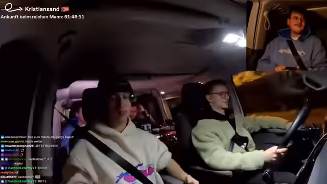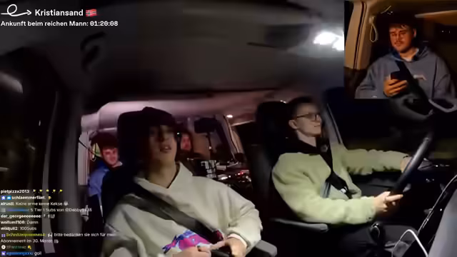 02:09:05Während der Fahrt mit dem Van erkennen die Streamer zufällig eine Person, die sie im Café zuvor getroffen hatten. Diese Person war mit seiner Mutter ins Auto gestiegen, und die Streamer beschließen, ihr per Auto zu folgen. Dabei werden sie auch von einem weiteren Auto begleitet. Die Situation wird als spontane und außergewöhnliche Interaktion beschrieben.