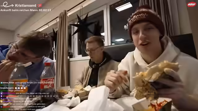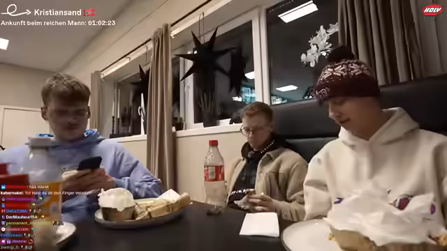 00:10:41Der Stream beginnt mit dem Willkommen zum siebten Tag der Skandi-Tour. Die Streamer befinden sich in einem Café in Zartrou und planen, nach Christian Sand zu reisen, um ein sogenanntes Feen-Schloss zu besichtigen. Die Route ist nicht ganz klar, und es gibt einige Verwirrung und kleine technische Pannen, wie das versehentliche Fallenlassen von Getränken und ein ungewöhnlicher Fahrstuhl im Hotel.