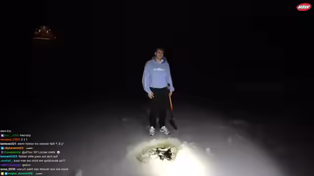 09:00:47Die Gruppe erreicht den See und stellt fest, dass das Eis überraschend dick und stabil ist. Die anfängliche Unsicherheit über die Dicke und Sicherheit des Eises weicht dem Eindruck einer fast magischen, festen Oberfläche. Mit einem Starlink-Gerät für Internetzugriff ausgestattet, beginnen sie mit dem Versuch, ein Loch ins Eis zu schlagen. Dies gestaltet sich als physically anspruchsvolle und komische Aktion. Der Versuch wird als 'dummstes Gefühl der Welt' beschrieben, während die Streamer mit Begeisterung und Humor die Kälte und die unkonventionelle Aktivität erleben.