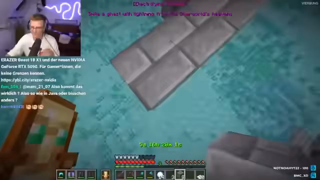 02:48:05Während sie auf das Gewitter warten, um das Ghast-Achievement abzuschließen, sammeln die Streamer weiteres Material für den Farmumbau. Heiko agiert hierbei als Lieferant und bringt benötigte Blöcke wie Slabs, Trapdoors und Betten. Sie erörtern auch die Möglichkeit, das Spiel "Schiffe versenken" zu spielen, wenn sie weiterhin auf das Gewitter warten müssen, und der Streamer schlägt vor, Heiko als offiziellen deutschen Commentator für die anstehende WM zu verpflichten.