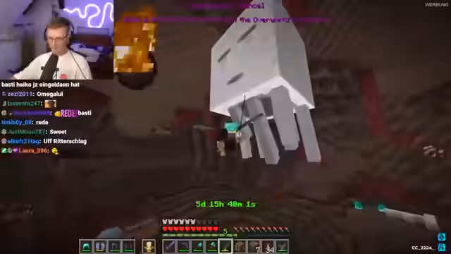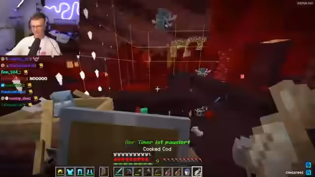 01:14:12Der Streamer und sein Partner setzen die 'Chunk = Random Monster' Challenge im Ultra Hardcore-Modus fort. Ziel ist es, den Enderdrachen zu besiegen. Dabei werden sie bei jedem Betreten eines neuenChunks von einer zufälligen Kreatur und einer unsichtlichen Grenze gefangen, die erst verschwindet, wenn die Kreatur besiegt ist. Das aktuelle Ziel ist es, Blaze-Rods zu sammeln, um Tränke herstellen zu können.
