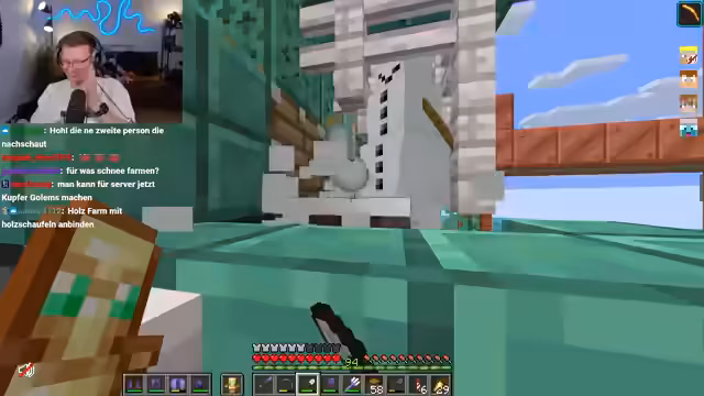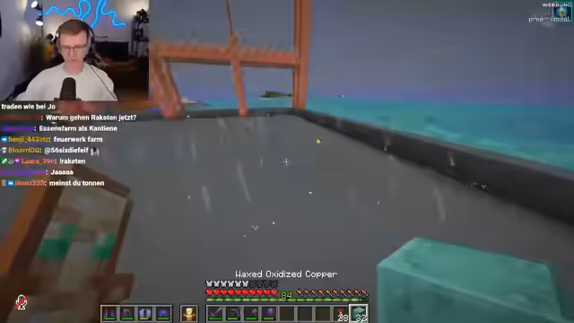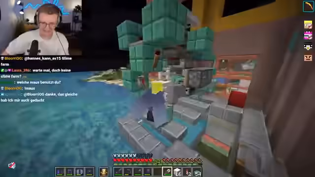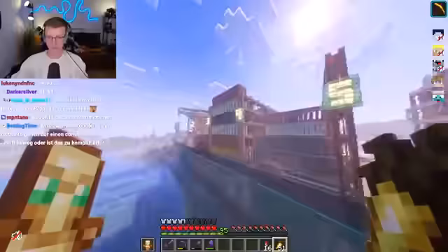 00:16:10Nachdem die Koordinaten der von Feli gebauten Guardian Farm ermittelt wurden, fliegt der Streamer dorthin, um sie zu inspizieren. Die Farm wird als 'Full-Afghaner' und 'neue Geile' bewertet und für gut befunden. Um den Anschein zu erwecken, die Farm sei selbst gebaut, wird ein Screenshot gemacht und überlegt, wie man sie am besten 'kapern' kann, ohne dass Feli es merkt. Ein Schild mit der Aufschrift 'Hier deine neue Farm. Hoffe, du hattest einen schönen Off-Day.' wird platziert, um die Übernahme zu dokumentieren. Es wird festgestellt, dass eine Enderman-Farm in der Overhead nicht gut funktionieren würde, während eine Creeper-Farm zwar möglich, aber wahrscheinlich ineffizient wäre. Die Diskussion kehrt zu den fehlenden Schiffselementen zurück, wobei der Bau von großen Meeresbojen vorgeschlagen wird. Diese sollen mindestens 3x3 Blöcke groß und 4-5 Blöcke hoch sein, aus Kupfergittern bestehen und im Bestfall mit Copper Vibes und Redstone-Lampen ausgestattet werden, um eine stimmungsvolle Beleuchtung bei Nacht zu schaffen. Es wird überlegt, ob veraltete und verrostete Designs passend wären. Der Streamer bemerkt, dass er abgelenkt wurde und eigentlich ein Buch holen wollte. Ein Anker für das Schiff wird ebenfalls als zukünftiges Projekt in Betracht gezogen, obwohl das Schiff bereits relativ stabil ist.