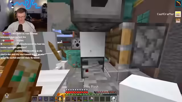 04:51:46Die Streamer beschäftigen sich intensiv mit dem Bau und der Optimierung einer Schneeball-Farm. Es wird eine komplexe Redstone-Schaltung entwickelt, die eine automatische Eisenschaufel-Clock und einen Autocrafter für Schneeblöcke beinhaltet. Die Idee ist, dass eine Eisenschaufel dauerhaft benutzt wird und sobald sie kaputt geht, eine neue gecraftet wird. Dieser Vorgang löst gleichzeitig das Herunterschieben von Schneebällen in den Crafter aus, der diese dann zu Schneeblöcken verarbeitet. Es werden verschiedene Bauweisen und Materialien diskutiert, um die Effizienz der Farm zu maximieren, darunter die Verwendung von Hopper, Iron Pressure Plates und die richtige Platzierung von Zäunen und Soul Sand. Die Diskussion dreht sich auch um die Menge der benötigten Schneebälle und die generelle Funktionsweise des Systems, wobei die Streamer versuchen, die Mechaniken vollständig zu verstehen und zu perfektionieren.