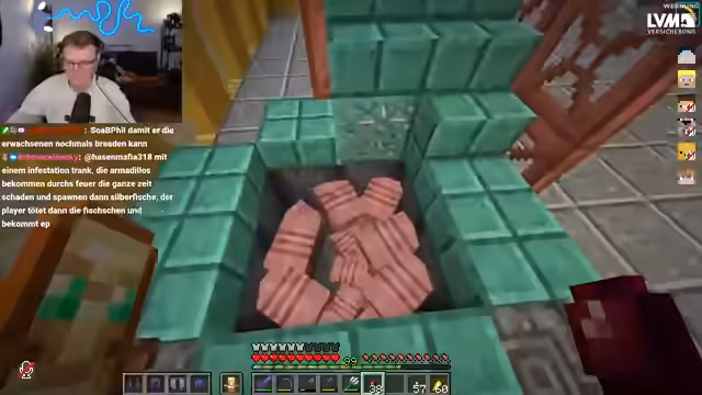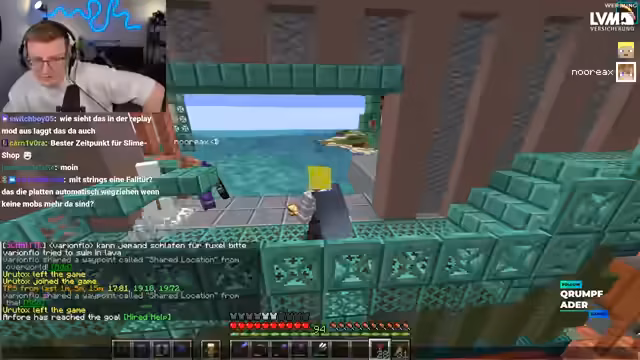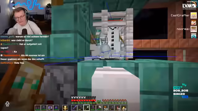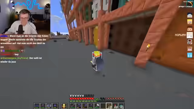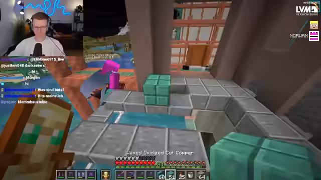 00:38:28Veto stößt zum Stream hinzu, und es gibt einen kurzen Austausch über ein Telefonat mit Notty, der offenbar einen Albtraum hatte. Veto präsentiert seinen Fortschritt beim Bau eines Berges und eines Skeletts, was vom Streamer als 'krass' und 'richtig geil' gelobt wird. Die Idee, einen Container zwischen dem Schiff und dem Skelett zu platzieren, um Knochen zu verladen, wird als passend empfunden. Veto kündigt ein Hide & Seek Event an, für das eine spezielle Mod verwendet werden soll, bei der man sich in Blöcke verwandeln kann. Der Streamer zeigt Interesse daran, diese Mod ebenfalls zu testen. Es wird über die Farbwahl für Vetos Container gesprochen, wobei Rot oder Gelb favorisiert werden. Veto entscheidet sich schließlich für einen pinken Container, der unter einem Glascontainer platziert werden soll. Die Dauer von Vetos Schicht wird thematisiert, da er am Vortag länger gearbeitet hatte. Der Streamer plant, die Mod herunterzuladen und gemeinsam mit Veto zu testen. Es gibt eine kurze Diskussion über die Kompatibilität der Mod mit verschiedenen Minecraft-Versionen, da die Community unterschiedliche Versionen verwendet. Die Idee eines Krankenhauscontainers wird als 'wilder Vorschlag' abgetan, da zunächst die praktischen und funktionalen Container fertiggestellt werden sollen, bevor Deko-Elemente in Angriff genommen werden. Die Sortierung der Shulker-Kisten und die allgemeine Lagerorganisation werden als chaotisch empfunden. Ein Marktplatz oberhalb des Lagers wird als gute Idee erachtet, wobei die Zugänglichkeit noch geklärt werden muss. Die Möglichkeit, eine Slime-Farm mit Schneegolems zu bauen, wird als 'sehr, sehr cool' empfunden und detailliert besprochen. Der Streamer zeigt sich begeistert von der Idee, Schnee automatisch zu farmen und zu Schneeblöcken zu verarbeiten, um sie dann für die Golems zu verwenden. Die Herausforderung, Kürbisse zu recyceln, wird ebenfalls diskutiert. Es wird die Sorge geäußert, dass die Farm aufgrund von 'ASIC Entity Ticking' nicht funktionieren könnte, aber dies soll getestet werden. Der Plan ist, eine Amadillo-XP-Farm und eine Slime-Farm in gegenüberliegenden Containern zu bauen, wobei die Slime-Farm zuerst realisiert werden soll.