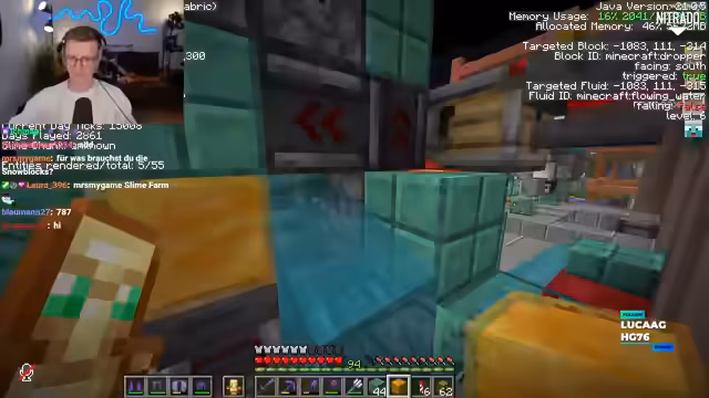 02:17:37Adi berichtet von einem außergewöhnlichen Red Bull Event in Tschechien, bei dem PCs in ein Flugzeug eingebaut wurden, um in der Luft Rocket League zu spielen. Verlierer wurden symbolisch aus dem Flugzeug geworfen. Der Streamer bedauert, aus Angst vor Höhen nicht teilgenommen zu haben. Zurück in Minecraft stellt der Streamer fest, dass der Bau der Slime Farm, insbesondere der Mechanismus für die Oozing Potions, einfacher war als erwartet. Er erklärt, dass 480 Golems pro Potion gespawnt werden können und überlegt, ob Lingering Potions anstelle von Splash Potions benötigt werden und ob Scaffoldings Entity Cramming ignorieren. Die Farm recycelt Kürbisse, was den Bedarf an neuen Kürbissen minimiert.