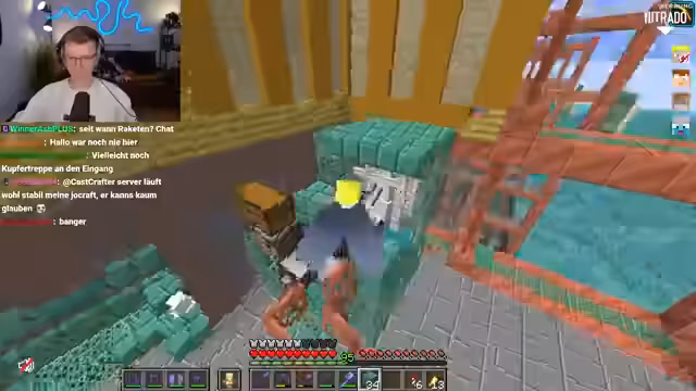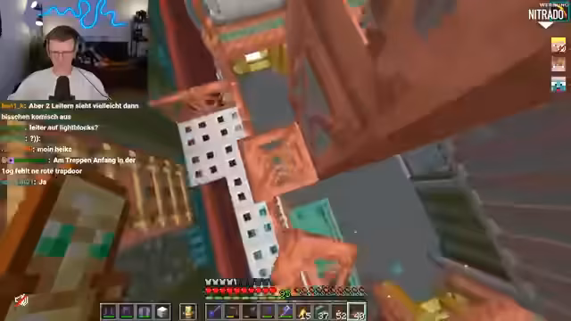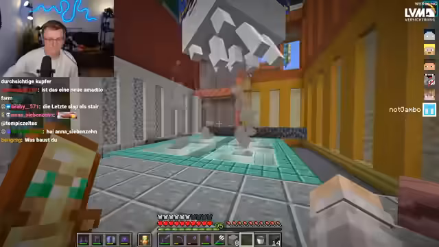 11:10:49Der Streamer ist begeistert von einer künstlerischen Gestaltung, die ein Teammitglied mit Airbrush auf eine Oberfläche aufgetragen hat. Er vergleicht das Ergebnis mit einem gedruckten Motiv und zeigt sich beeindruckt von der Qualität und dem Aussehen. Es wird auch über die Wahl eines Kontrastblocks zu oxidiertem Kupfer diskutiert, wobei dunkle Kontraste wie Endstone oder Briggs vorgeschlagen werden. Die Bauarbeiten schreiten voran, und es wird über die Anordnung von Allays im Raum gesprochen. Die Idee, Allays an Leinen zu befestigen, um einen 'Kronleuchter'-Effekt zu erzeugen, wird erörtert, wobei die Komplexität der Anordnung und die Möglichkeit der freien Bewegung im Raum diskutiert werden. Die ästhetische Gestaltung und die Integration von Minecraft-Elementen in die Architektur stehen im Vordergrund.