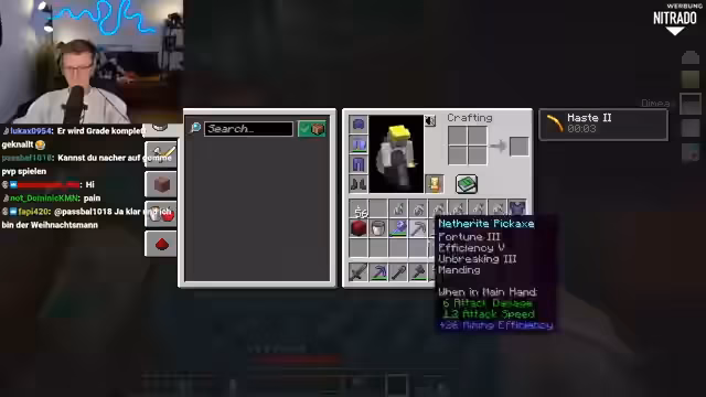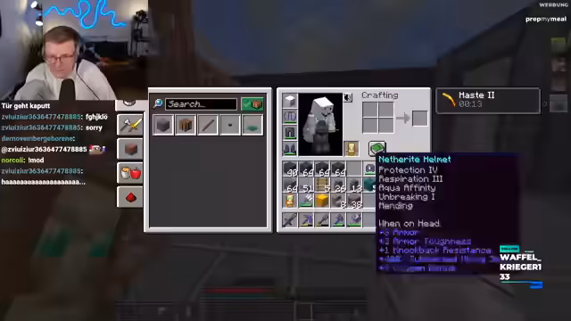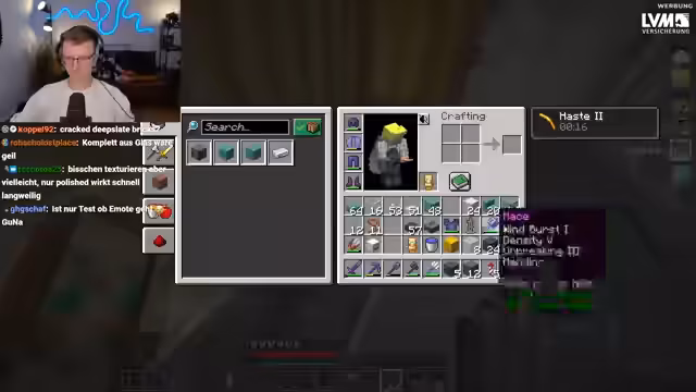 14:45:32Der Streamer erkennt, dass die Lösung des Rätsels mit Wasser und dem Füllen eines Kessels zusammenhängt, was er zuvor bereits vermutet hatte. Er stellt fest, dass er die ganze Zeit die richtige Idee hatte, diese aber nicht konsequent verfolgt hat. Die Erkenntnis, dass er nicht auf Partikel geachtet hat und nur auf Schalter fokussiert war, erklärt seine Schwierigkeiten. Er entdeckt, dass der Escape Room in verschiedenen Versionen existiert und die Items sowie Rätsel variieren können. Die Suche nach einem versteckten Item in einem Labyrinth geht weiter, und er versucht, Shulker-Kisten zu öffnen, um weitere Hinweise zu finden. Die Diskussion im Chat dreht sich um die Eigenheiten des Streamers, Ansätze zu beginnen, sie aber nicht vollständig zu verfolgen. Er sammelt weitere Items und entdeckt einen geheimen Crafting Table, der ihm ermöglicht, noch mehr Wasserflaschen herzustellen, was ihn der Lösung des Rätsels näherbringt.