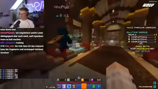 03:45:05Nach dem Schädlings-Einsatz wechselt der Fokus zum Training für das bevorstehende Minecraft Championships (MCC). Der Streamer ist frustriert, dass sein Team in den Community-Predictions oft schlecht platziert ist. Gemeinsam mit Vince diskutiert er die Maps und Modus-Liste für das Event. Sie trainieren Parkour-Maps, um im Jump'n'Run-Bereich besser zu werden. Es gibt eine Debatte über die Terminfindung für das Training, da der Streamer an der Twitchcon teilnehmen wird.