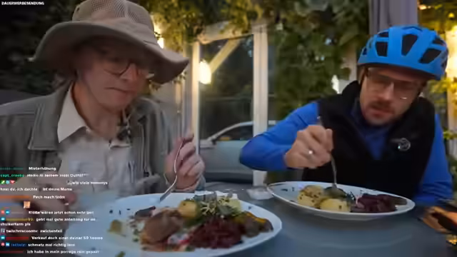 02:32:44Nach Ankunft im Restaurant wird intensiv über die Speisekarte diskutiert. Der Streamer stellt eine persönliche Verbindung zu Rinderrouladen her, da seine Oma aus Schlesien stammt. Die Entscheidung für Rinderrouladen fällt nach längerer Abwägung gegen das allgegenwärtige Schnitzel. Bestellt werden außerdem Pirogi für die Runde, während der Streamer aus Sicherheitsgründen seinen Helm beim Tragen nicht absetzt, was einen running gag bildet und auf seine Gehirnverletzung von 2006 Bezug nimmt.
