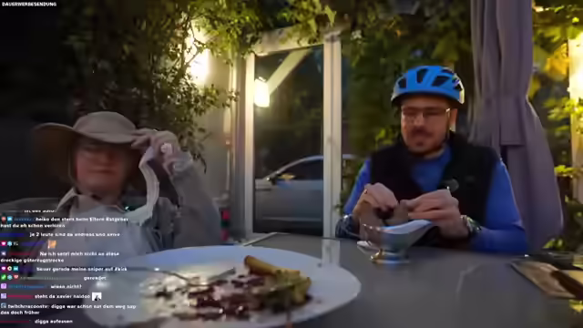03:17:33Die Rouladen werden serviert und als sehr lecker befunden. Eine Person isst zum ersten Mal in ihrem Leben eine Roulade. Es wird überlegt, ob man Sitze nehmen soll. Eine Person dollt sich Zitrone ins Auge. Es wird darüber gesprochen, Vegetarier gewesen zu sein und jetzt wieder Fleisch zu essen. Eine Person jammert über den schlechten Support und droht, sich das Geld über die Miete wiederzuholen. Es wird überlegt, mehr solche Arrangements zu machen, aber es fehlt das Budget. Es wird über ein Erlebnis mit Sahne-Meerrettich im KitKat gesprochen. Eine Person beschwert sich über den Geschmack einer Gurke und kotzt. Es wird behauptet, Andreas Burani im Hintergrund zu sehen. Es wird über die Hartz-IV-Hänger-Community gelästert, die sich kein Bahnticket leisten kann. Eine Person fragt, ob sie braune Soße aus dem Bauchnabel einer anderen Person trinken darf. Es wird über die Angst gesprochen, auf der Autobahn abgeknallt zu werden. Heiko wird mit einem dementen, vollgeschissenen Windel-Opa verglichen. Es wird überlegt, ob Kevin in einem Callcenter arbeitet und Leute scammt. Es wird vermutet, dass hinter ihnen das Auto von Andreas Borani steht. Eine Person droht, eine andere in die Fresse zu hauen. Es wird überlegt, nach Bonn zu ziehen. Es wird überlegt, einen polnischen Apfelkuchen zu teilen. Eine Person wirft mit Gurken um sich. Es wird überlegt, was passieren würde, wenn man sich hier in die Luft sprengen würde.