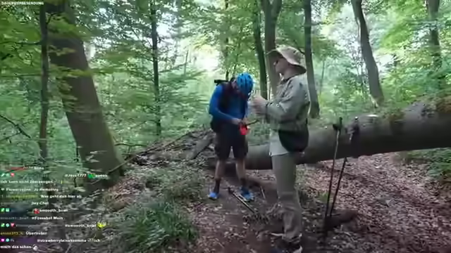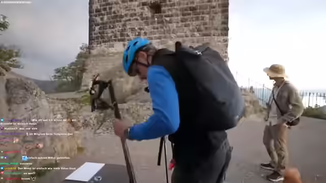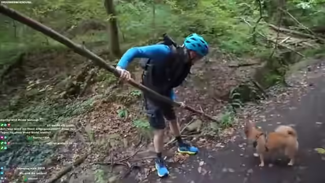 00:01:33Der Stream startet mit dem Hinweis auf ein Altwaldgebiet, das auf eigene Gefahr betreten wird. Es beginnt der Aufstieg zum Drachenfels, der im Stream als K2-Besteigung inszeniert wird. Die Protagonisten befinden sich im Basecamp auf 2.400 Metern Höhe und geben an, dass noch 6.400 Meter vor ihnen liegen. Die Produktion roter Blutkörperchen zur Akklimatisierung sei bereits im Gange. Begleitet werden sie von ihrem 'Sherpa', dem Hund Akani. Es wird vor Höhenkrankheit gewarnt, aber Zuversicht ausgedrückt, das Ziel zu erreichen. Der Aufstieg soll etwa 2,5 Stunden dauern, bis zum Gipfelkreuz. Ein Einheimischer, wird als Sherpa bezeichnet, trägt die Sachen, während ein 'Gebirgslöwe' die Gruppe anführt. Ein verstopfter Bach wird von Monte kurzfristig freigeräumt. Es wird auf alte Befestigungsanlagen und eine ehemalige Toilette hingewiesen. Die Qualität des Streams wird aufgrund der Verbindung durch Carsten entschuldigt.