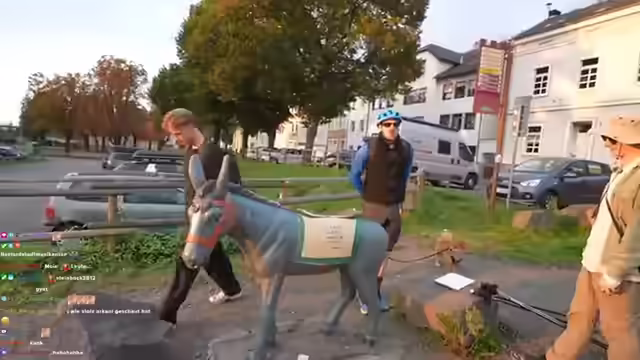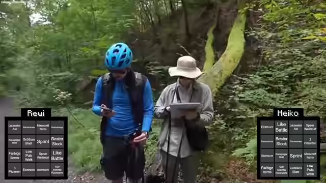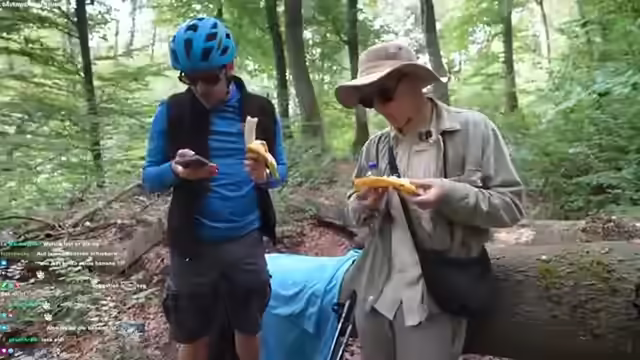 00:47:34Die Pulswerte werden gemessen und verglichen. Es wird über die Jahreszeit (Herbst) und die potentielle Giftigkeit von Borkenkäfern diskutiert. Es wird ironisch kommentiert, dass Bergsteigen nicht anstrengend sei. Es werden Zeichen im Wald interpretiert (KG, X kleiner gleich K) und als Hinweis auf einen hochgiftigen und schwer verseuchten Wald gedeutet. Ein Bingo-Feld wird bemerkt. Es wird angekündigt, dass die nächsten Streams wieder von zu Hause kommen werden. Es wird überlegt, ob man ein guter IRL-Streamer wäre. Es wird der Ursprung des Uralsees thematisiert. Es wird versucht, das Pferd zu lesen. Es werden Höhlen betrachtet und der vermisste Bruder Joshua erwähnt.