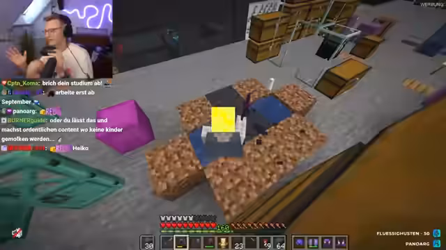 02:50:10Der Streamer wechselt das Thema und konzentriert sich auf den Bau seiner Base in Craft Attack. Nach einem langen Urlaub fehlt es an Materialien wie Honig und Beton. Das Event vor dem Wochenende wird abgesagt, da der Streamer einen Trip nach Bayern plant. Die Priorität liegt nun darauf, die Basis zu fertigzustellen. Der Fokus ist auf Funktionalität, Deko ist zweitrangig. Gemeinsam mit der Community werden nun die nächsten Schänge zum Ausbau des Basis-Cubes geplant.