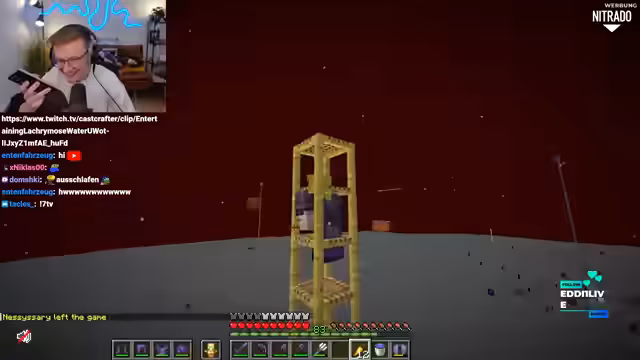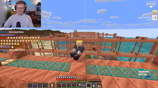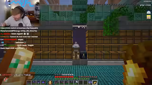 07:20:31Während des Rollenspiels kommt es zu einer Explosion, als ein End-Crystal gezündet wird, was zu Zerstörung und Chaos führt. Der Streamer ist entsetzt über die Konsequenzen und die Reichweite des Crystals. Er bereut das Rollenspiel und die entstandenen Schäden. Die Musik wechselt zu einem Song, der im Gefängnis gespielt wurde, was die Stimmung weiter anheizt. Die Diskussion kehrt zu den Stream Awards zurück, wobei der Streamer sich fragt, ob er als Begleitung mitgenommen wird, da er nicht nominiert ist. Es kommt zu einer humorvollen Debatte über die Einladungspraxis. Kevin kündigt an, die Base des Streamers in Minecraft zu besuchen, um den Fortschritt zu begutachten. Die Diskussion geht weiter über die Ästhetik von Gebäuden in Minecraft, insbesondere über Noreax' Berg und Kevins Häuser, die als „Doppelhaushälfte Schleswig-Holstein type shit“ bezeichnet werden. Der Streamer sucht nach Redstone-Tipps und fragt, ob man eine Banane in ein Rennauto verwandeln kann. Die Episode endet mit der Planung einer versteckten Tür für einen Bunker, die unter Wasser getarnt werden soll, um sie unauffällig zu gestalten.