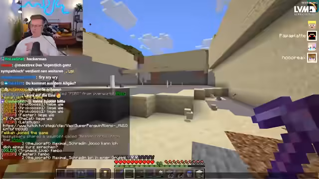 00:42:52Die Suche nach Leder für Bauprojekte erwies sich als schwierig, da Merles Farm nicht die erwartete Menge lieferte. Daraufhin wurde beschlossen, bei Trimax nach Kühen zu suchen. Dabei wurde ein gigantischer Tunnel entdeckt, den Trimax und sein Team gebaut hatten, um Papa Platte anzugreifen. Dieser Tunnel, der für den Transport von Pferden und Kühen genutzt wurde, beeindruckte den Streamer durch seine Länge, Größe und den offensichtlich enormen Zeitaufwand, der für seinen Bau nötig gewesen sein muss. Es wurde spekuliert, dass der Bau des Tunnels zwölf Stunden gedauert haben könnte. Trotz des Aufwands wurde die Kreativität und der Zweck des Tunnels, nämlich das Eindringen in die Basis, als "geil" und "sehr, sehr geil" bewertet. Die anschließende Suche nach Kühen bei Trimax war jedoch ebenfalls nicht sehr erfolgreich, da kaum noch Kühe vorhanden waren. Es wurde jedoch festgestellt, dass der Golem-Bau bei Trimax bereits weit fortgeschritten ist. Der Streamer plant eine zukünftige "Ein-Monats-Craft-Attack-Tour", um alle bisher ungesehenen Teile der Welt zu erkunden.