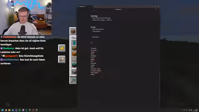 01:27:29Die detaillierte Planung der Lageranordnung wird fortgesetzt, wobei der Streamer seine Unzufriedenheit mit dem vorherigen System äußert, bei dem die Positionierung der Kisten unlogisch war. Er betont die Wichtigkeit einer intuitiven Anordnung, bei der häufig genutzte Materialien wie Holz, Stein und Grünzeug in den Hauptbereich des Lagers kommen, während weniger oft benötigte Gegenstände wie Schätze, Tools und bestimmte Farbstoffe in ein 'Special Lager' ausgelagert werden. Die Anordnung der Holzkisten wird spezifisch geplant, beginnend mit Oak, Spruce, Birch und weiteren Holzarten. Redstone-Komponenten und Rohstoffe sollen ebenfalls leicht zugänglich sein. Die Platzierung von Nether-, End- und Ocean-Items wird am hinteren Ende des Hauptlagers vorgeschlagen. Eine besondere Herausforderung stellt die Sortierung von Terrakotta, Wolle, Beton und Glas dar, die ebenfalls im Hauptlager untergebracht werden sollen. Der Streamer schätzt, dass 18 Kategorien in das ausgelagerte Lager verschoben werden müssen, darunter Korallen, Tränke, Schätze, Tools, Rüstungen, Mob- und Animal-Drops, Raketen, Deko, Beleuchtung, Arbeitsblöcke und möglicherweise Grünzeug und Farbstoffe. Die genaue Platzierung von Steinarten wie Deep Slate, Tuff, Andesite, Diorite, Granite, Cobble und Stone wird ebenfalls diskutiert, ebenso wie Kupfer und gewachstes Kupfer. Die Ankunft von Heiko, einem befreundeten Streamer, unterbricht die Planung. Heiko befindet sich ebenfalls in einem Umzugsprozess und es wird ein Treffen vereinbart, um technische Projekte und Sicherheitskonzepte zu besprechen. Der Streamer teilt Heiko seine Lagerplanung mit und hofft auf eine bessere Zufriedenheit als im Vorjahr.