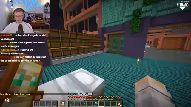 07:40:19Es wird über Hugo und seine roten Haare gesprochen, die er sich offenbar gefärbt hat. Die Farbe wird als „dolle rot“ beschrieben und als „cool“ empfunden. Später wird enthüllt, dass Hugo seine Haare aufgrund eines „Sellout“-Rads färben musste, bei dem er neunmal auf „Haare färben“ landete. Der Streamer ist auf der Suche nach grünen Froglights, die er nicht finden kann. Er überlegt, wie man effizient bauen könnte und erwähnt, dass er AFK im Nether steht, um auf die Froglight-Farm zu warten. Es wird ihm geraten, Froglights im Shopping District zu kaufen, wo Blizzard 16 Stück für einen Diamanten anbietet, was als „übergünstig“ und „stabiler Preis“ empfunden wird.