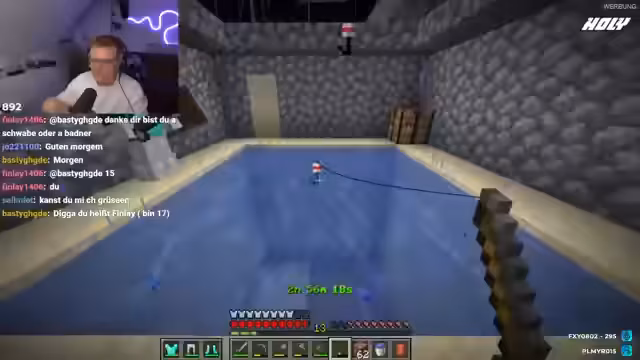 07:02:28Die Streamer beginnen mit dem Angeln und erläutern den Chat, wie man in Minecraft Schätze wie verzauberte Böge, Bücher und Nautilusschalen angeln kann. Dies erfordert eine Wasserfläche von mindestens 5x5 Blöcken und eine Tiefe von vier Blöcken. Heiko fängt einen Knochenfisch, der für die Herstellung von Wasseratem- und Gifth Tränken genutzt werden kann, während Basti nach einem guten Angelruten-Verzauberung sucht.