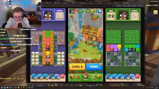 06:30:38Eine große Ankündigung schlägt Wellen: ein neues Mobile-Spiel mit dem Namen 'Minecraft Blast' wird enthüllt. Das Spiel ist ein Match-3-Puzzle-Game, ähnlich wie Candy Crush, thematisch aber in der Minecraft-Welt. Die Streamer diskutieren die Marketing-Strategie von Microsoft, die Partnerschaft mit den Candy-Crush-Entwicklern und prognostizieren hohe Downloads, aber auch potenziell negative Aspekte wie 'Microtransaction Nightmare'.