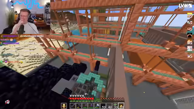 05:20:59Nachdem das Flug-Thema geklärt ist, konzentrieren sich die Spieler auf ihre jeweiligen Bau-Projekte. Während ein Spieler weiter an einer Brücke baut, zeigt ein anderer seine fortgeschrittene Konstruktion, die wie ein riesiger Kochtopf beschrieben wird. Die Streamer unterhalten sich über die Architektur und schlagen verschiedene Baumaterialien wie Glasblöcke für schräge Elemente und Eisenblöcke für Stützen vor. Ein geplantes 'Coworking' wird erwähnt, bei dem die Streamer parallel an ihren Projekten arbeiten und dabei im Gespräch bleiben.