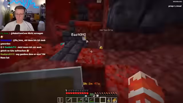 02:19:23Nach dem Betreten des Nethers graben sich die Spieler sicher durch Netherrack, um Piglins und Hoglins zu umgehen. Sie entdecken einen Crimson Forest und planen, eine Treasure-Bastion zu plündern. Dabei wird diskutiert, ob Goldrüstungen für den Schutz notwendig sind. Die Gruppe bleibt unterirdisch, um Risiken zu minimieren, und sucht gezielt nach einer Festung für Enderperlen.