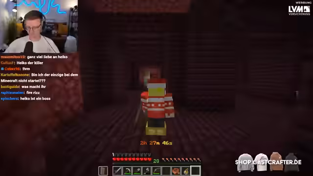 02:57:15Nachdem die Bastion gecleared ist, besitzt die Gruppe Diamanten, Gold und Enderperlen. Sie koordiniert den weiteren Verlauf, um Ender-Perlen für das Portal zu farmen. Trotz einiger Nervernisse (z.B. Lava-Gefahr) bleibt das Team fokussiert. Der Stream endet mit der Vorbereitung auf den Nether-Ausgang und der Planung der nächsten Schritte für die Challenge.