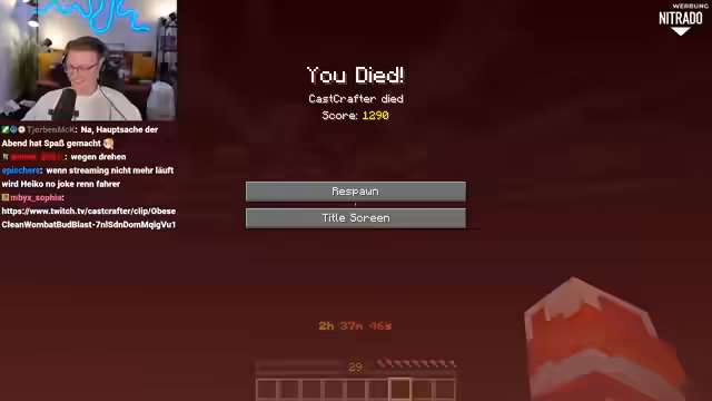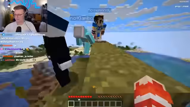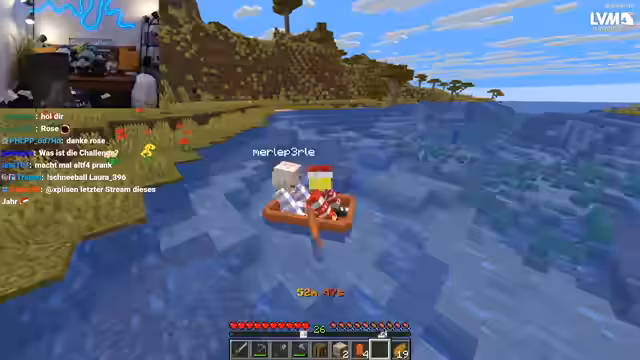 02:01:36Nachdem die Gruppe in der Wüste gestartet ist, fehlt es an Holz und Nahrung. Spieler verlieren durch Hunger oder Umweltgefahren Lebenspunkte. Es gibt Diskussionen über sinnvolle Trades mit Villagern für Essen und Grundausstattung. Ein Goldapfel wird als unsterblich falsch eingeschätzt, was zu tödlichen Stürzen führt. Die Gruppe plant, in ein Dorf zurückzukehren, um sich neu zu equippen und nach Holz zu suchen.